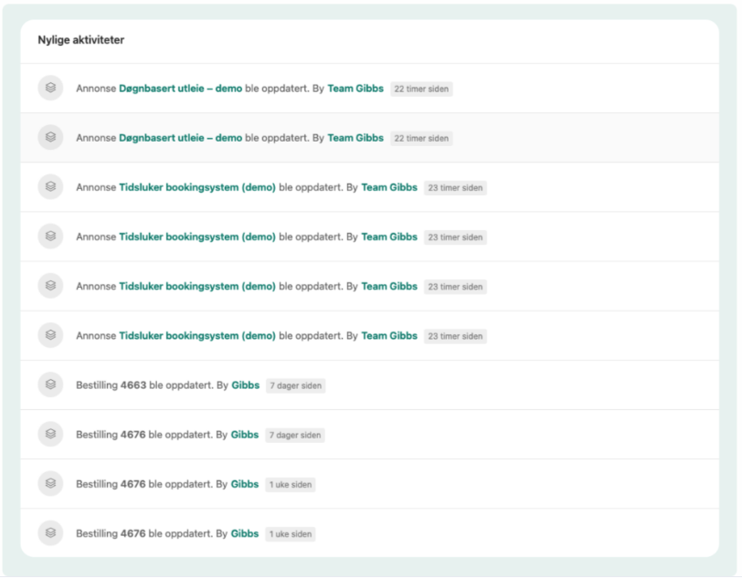 Aktivitetsloggen gir en oversikt over alle handlinger og aktiviteter knyttet til bookinger og utleieobjekter. Dette inkluderer informasjon som når en booking ble opprettet, når den ble endret eller kansellert, hvem som gjorde endringen, og hva endringen var. Den gir også en fullstendig oversikt over all aktivitet relatert til et utleieobjekt, slik at administratorer kan spore endringer og sikre at alt går som det skal. Dette gir en ekstra sikkerhet og mulighet for å spore eventuelle problemer som måtte oppstå.